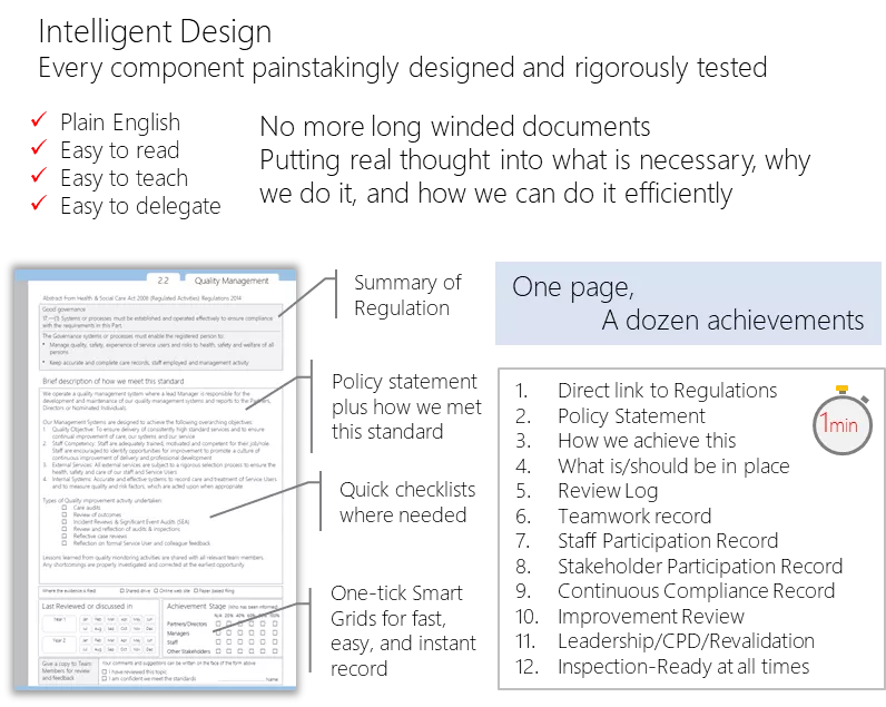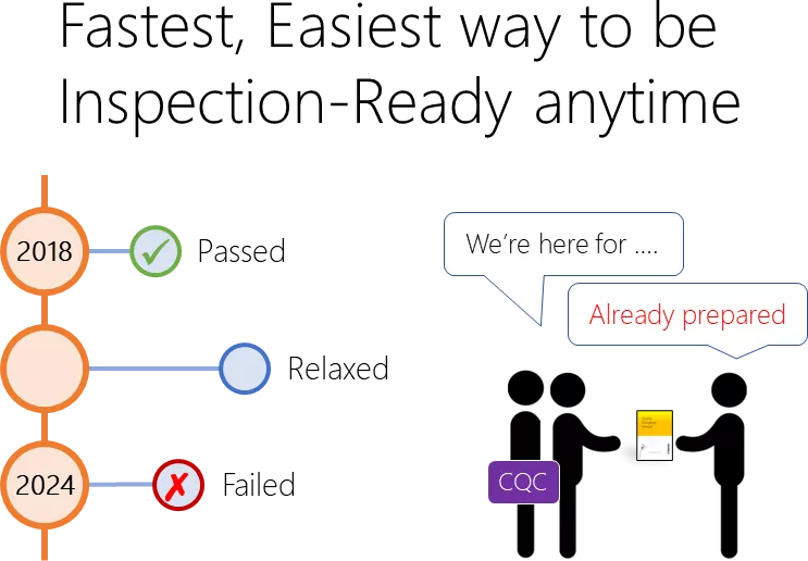 FIRST IMPRESSIONS MATTER A structured and risk prioritised approach to organising compliance and evidence. This is a tool to get Providers inspection-ready, quickly and easily. No disruption to your exisitng system; helps you organise your work and showcase your evidence in a professional well presented manner.